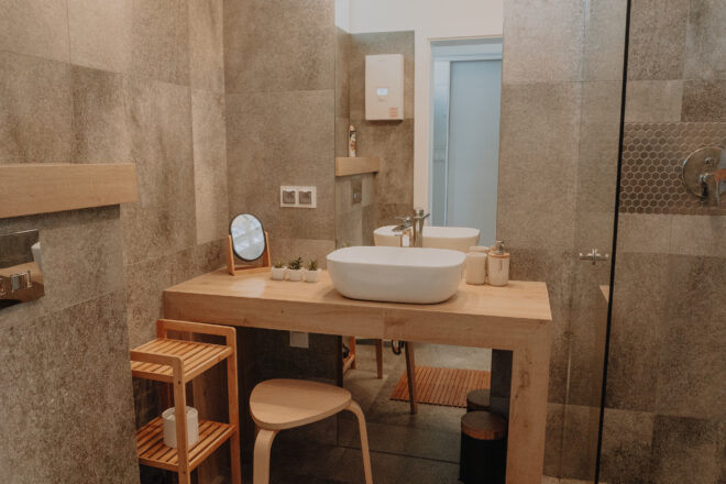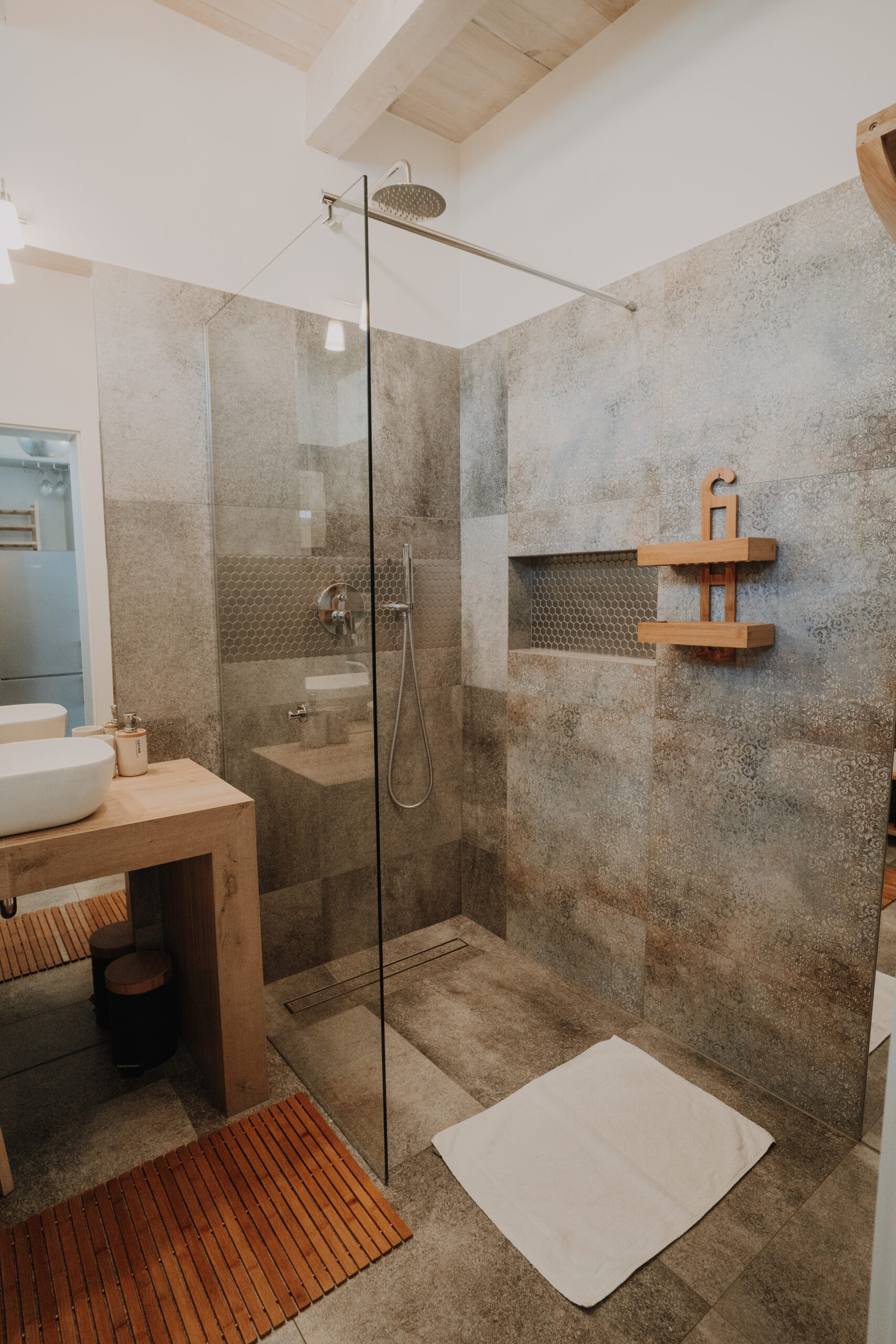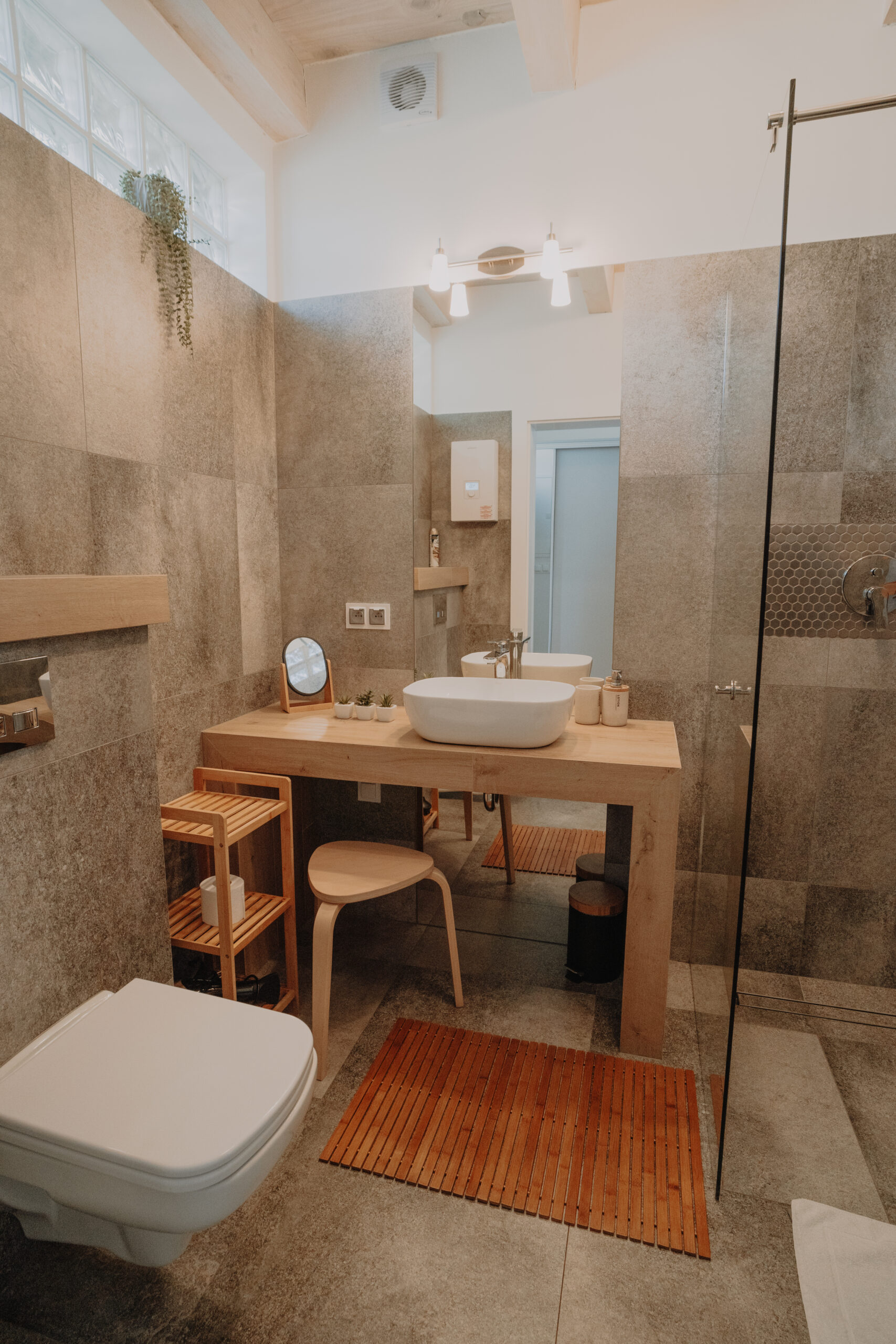 Na parterze znajduje się przestronna łazienka, urządzona w nowoczesnym stylu. Wyposażona w duży prysznic, umywalkę i toaletę, gwarantuje wygodę i komfort podczas pobytu.
