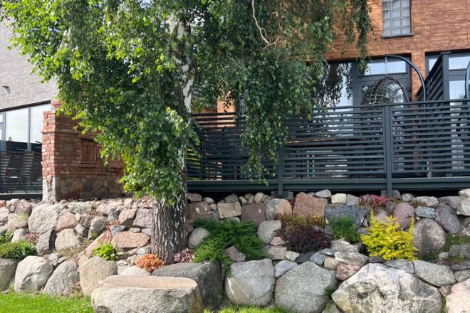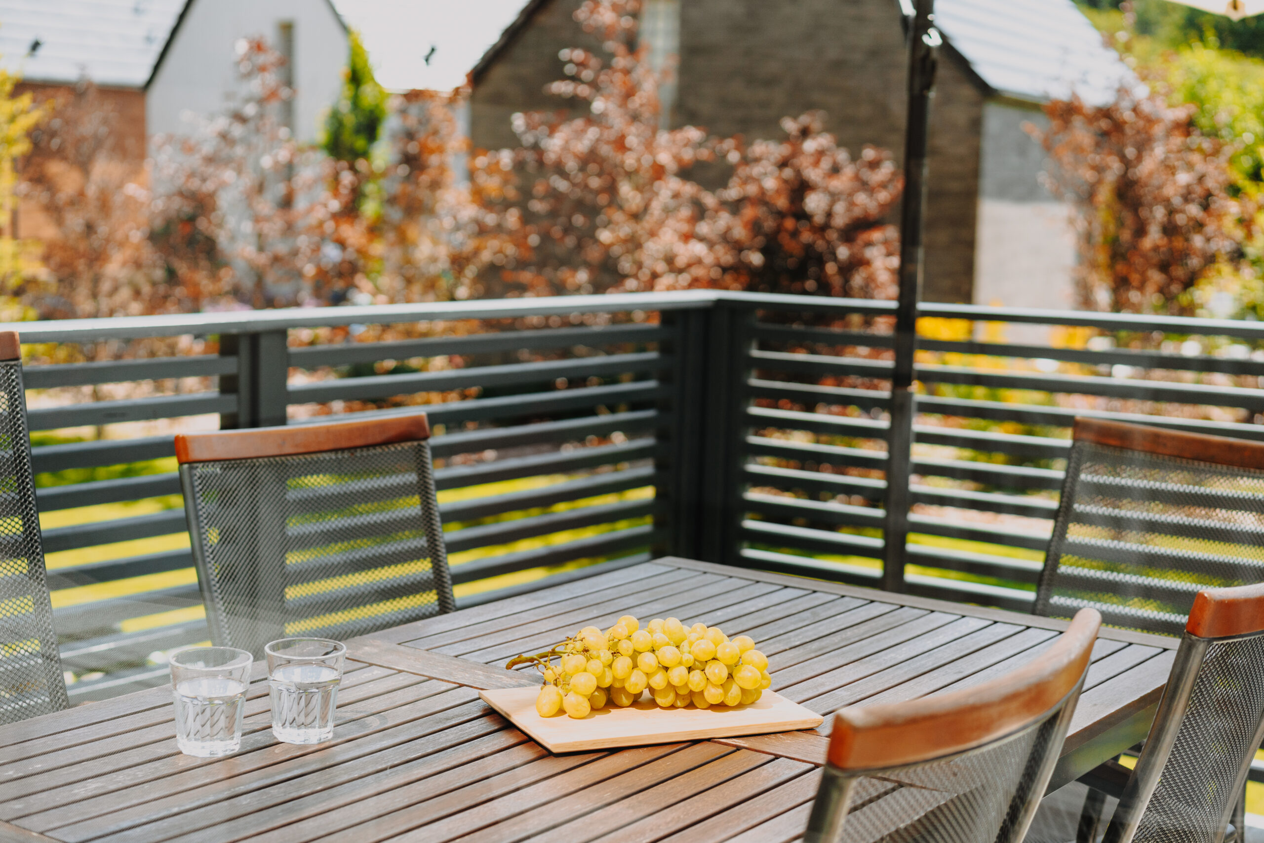 Z salonu prowadzi wyjście na ogrodzony taras, otoczony zielenią, która gwarantuje prywatność i ciszę. Taras to idealne miejsce na poranną kawę, wieczorne biesiadowanie z najbliższymi czy po prostu relaks w otoczeniu przyrody. Ogród wokół domu zachęca do spędzania czasu na świeżym powietrzu.