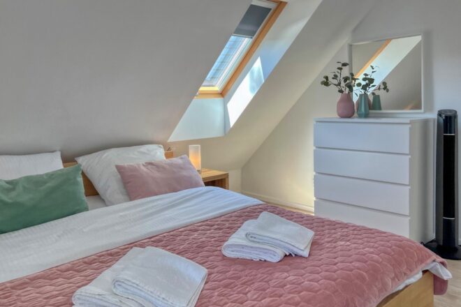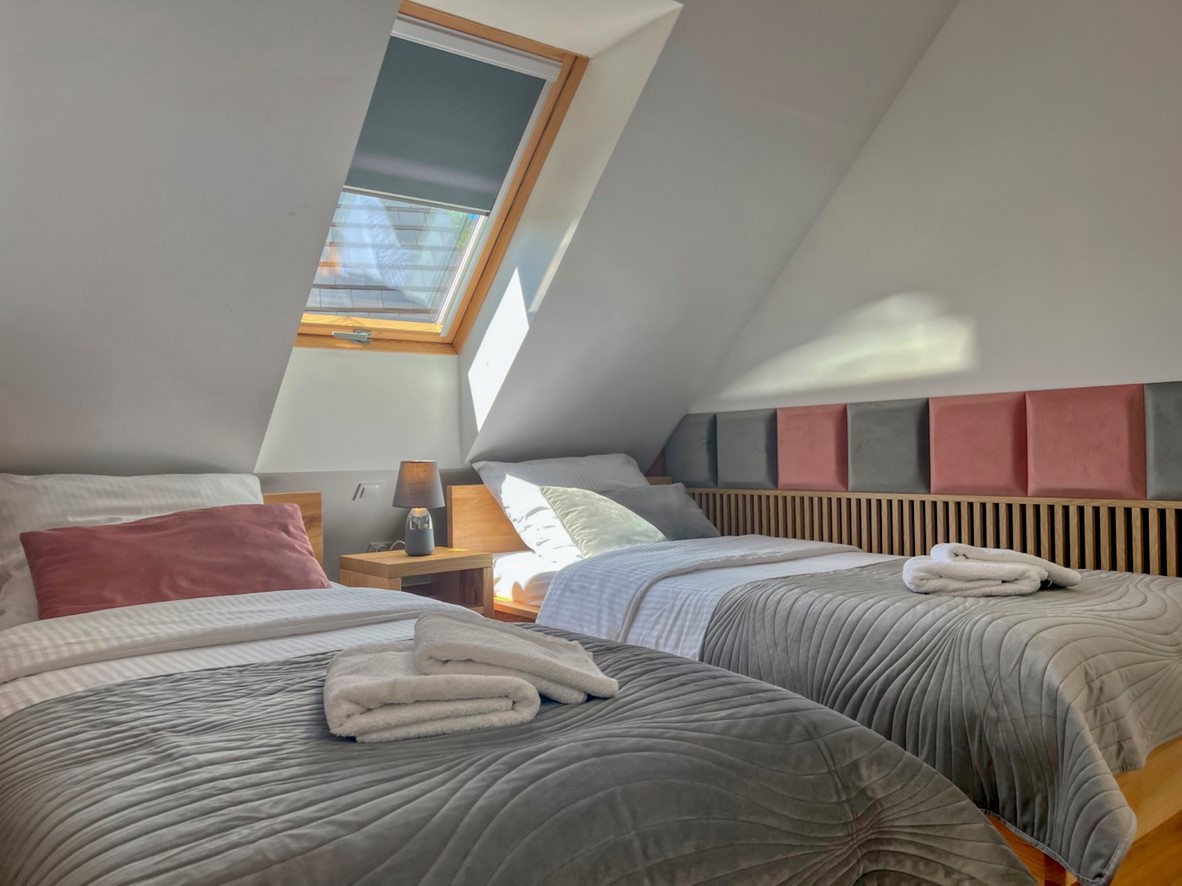 Dom Horyzont zapewnia nocleg dla maksymalnie 5 osób. Na piętrze znajdują się dwie przestronne sypialnie, urządzone w ciepłych i stonowanych kolorach. Wygodne łóżka i funkcjonalne rozwiązania sprawiają, że sypialnie są idealnym miejscem na regenerację po aktywnym dniu spędzonym na świeżym powietrzu.