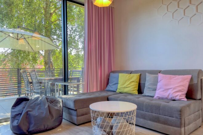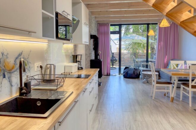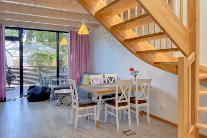 Dom wakacyjny Bryza to idealne miejsce na niezapomniany wypoczynek w gronie rodziny i przyjaciół. Położony w otoczeniu zieleni, łączy w sobie nowoczesny design, komfortowe wnętrza oraz bliskość natury. Przestrzeń domu została zaprojektowana z myślą o maksymalnym komforcie i relaksie, oferując wszystko, czego potrzebujesz podczas wakacyjnego pobytu.