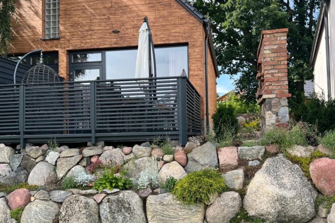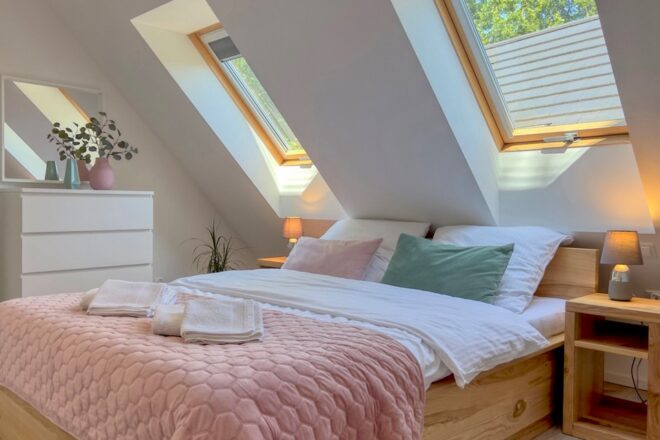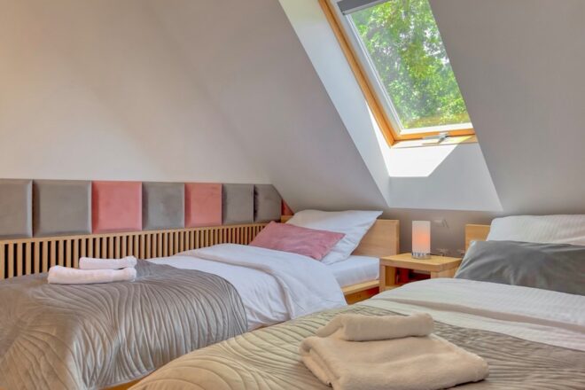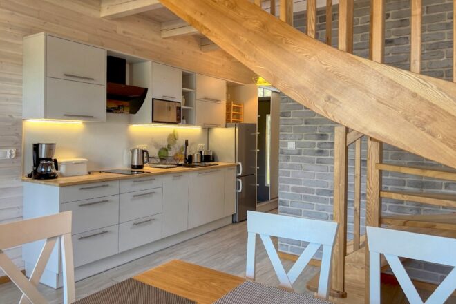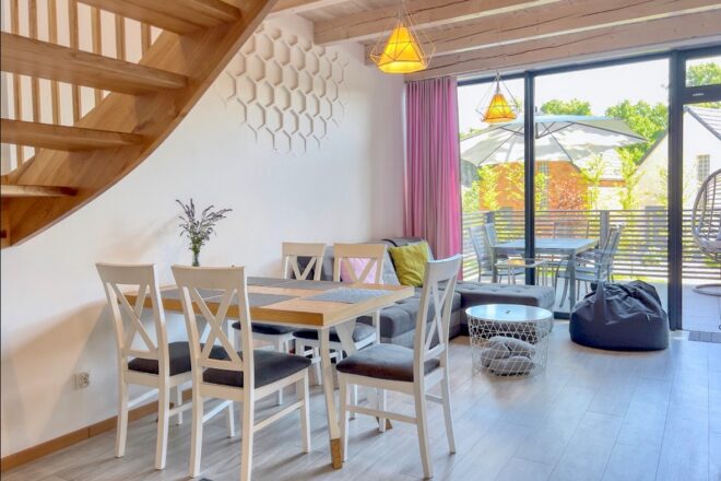 Dom wakacyjny Horyzont łączy wygodę, nowoczesność i bliskość natury. Dzięki kominkowi, ogrodzonemu tarasowi i otoczeniu zieleni jest to miejsce, w którym odpoczniesz i naładujesz baterie. To idealny wybór na rodzinne wakacje, wyjazd z przyjaciółmi czy romantyczny weekend.
