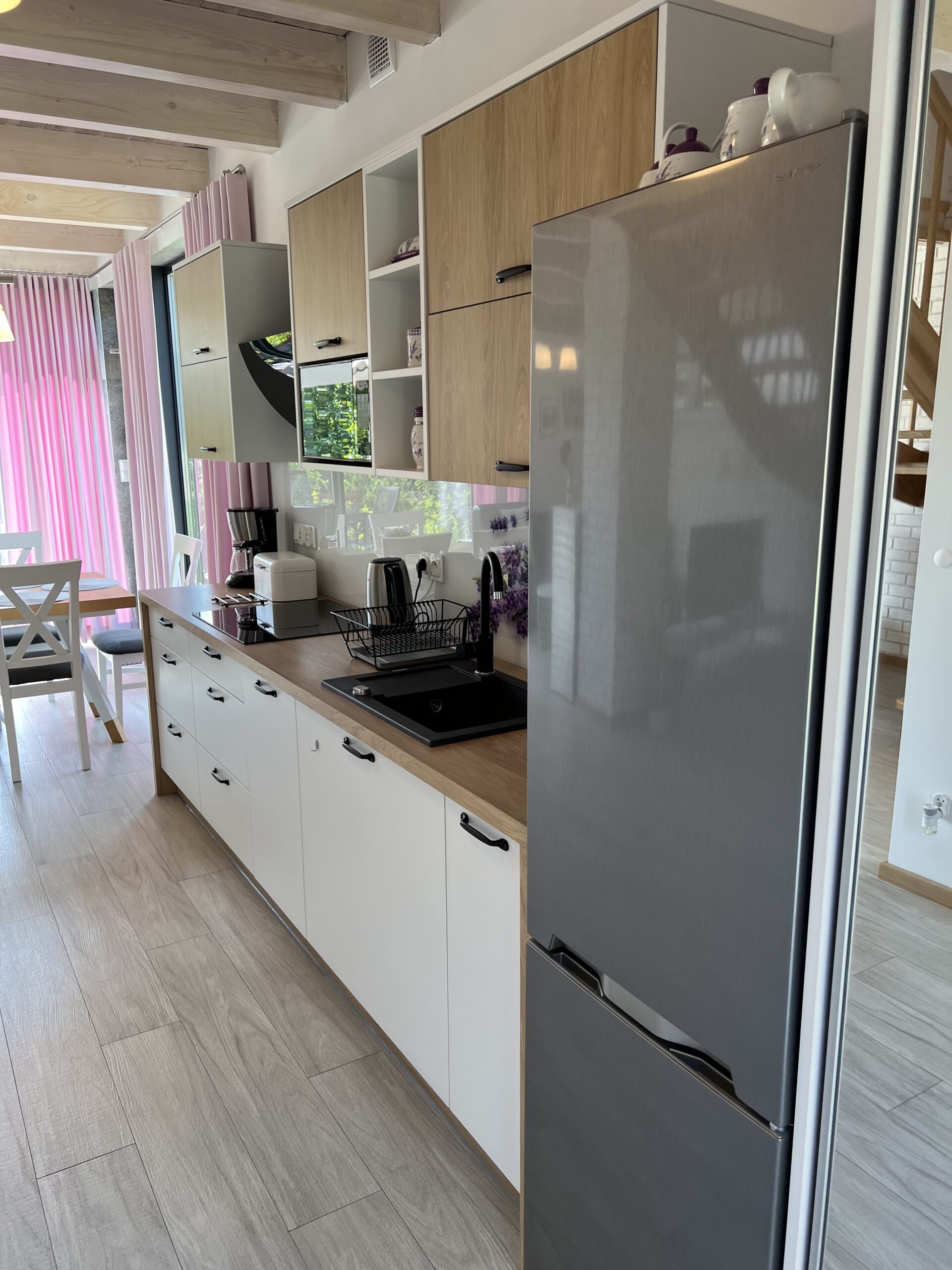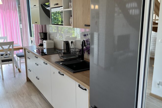 Parter domu to przestronna, otwarta strefa dzienna, w której znajdziesz w pełni wyposażoną kuchnię, jadalnię oraz przytulny salon. Kuchnia jest przygotowana z myślą o samodzielnym gotowaniu – posiada wszystkie niezbędne sprzęty, takie jak płyta indukcyjna, zmywarka, lodówka oraz ekspres do kawy. Jadalnia przy kuchni to doskonałe miejsce na wspólne posiłki.