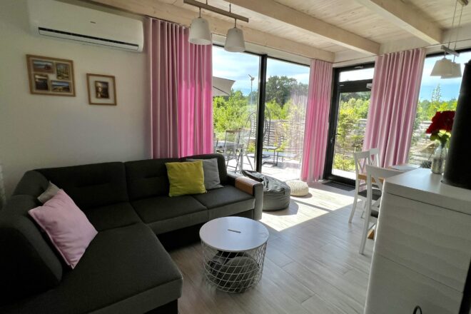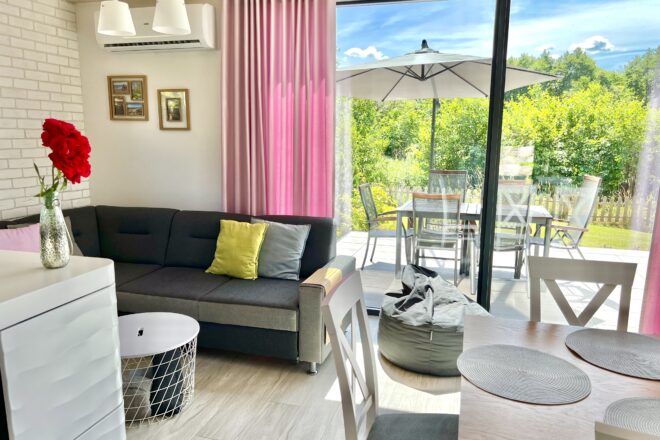 Salon z wygodną sofą oraz dostępem do telewizji stanowi idealne miejsce na relaks po dniu pełnym atrakcji. Dzięki dużym przeszkleniom wnętrze jest pełne naturalnego światła, a drzwi tarasowe prowadzą bezpośrednio na przestronny taras.