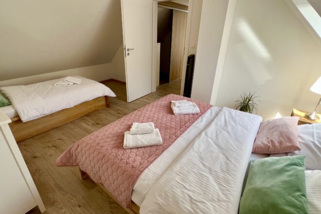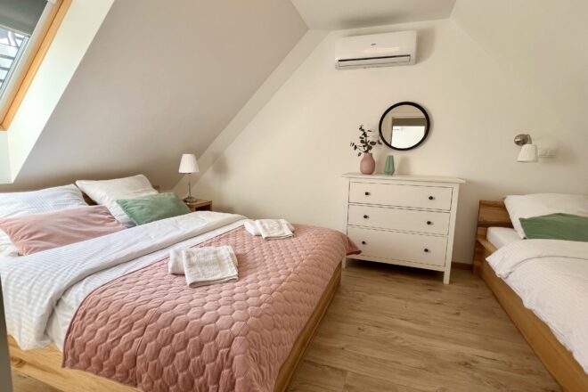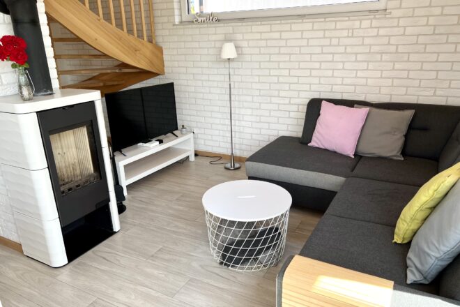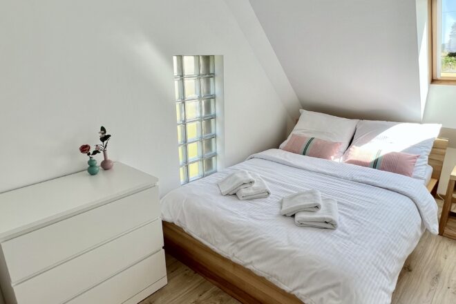 Dom może wygodnie pomieścić do 6 osób, zapewniając nocleg w dwóch przestronnych sypialniach na piętrze. Każda z sypialni urządzona jest z myślą o relaksie, wyposażona w wygodne łóżka oraz dodatkowe miejsce do przechowywania rzeczy. Na piętrze znajduje się również garderoba, oferująca sporo miejsca na ubrania i bagaż, co pozwala na utrzymanie porządku przez cały pobyt.