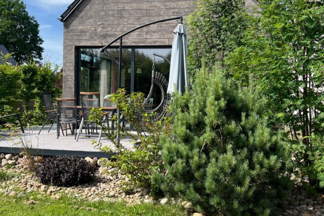 Taras to prawdziwe serce domu Wydma, idealne na poranną kawę, całodzienne wygrzewanie na słoneczku czy odpoczynek z książką. Otoczony zielenią, oferuje pełną prywatność i widok na piękny ogród, który stanowi doskonałe miejsce do relaksu na świeżym powietrzu.